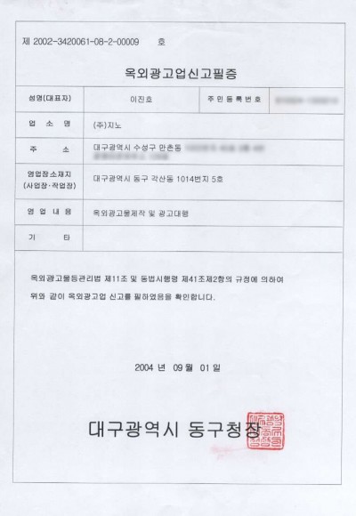 옥외광고업신고필증