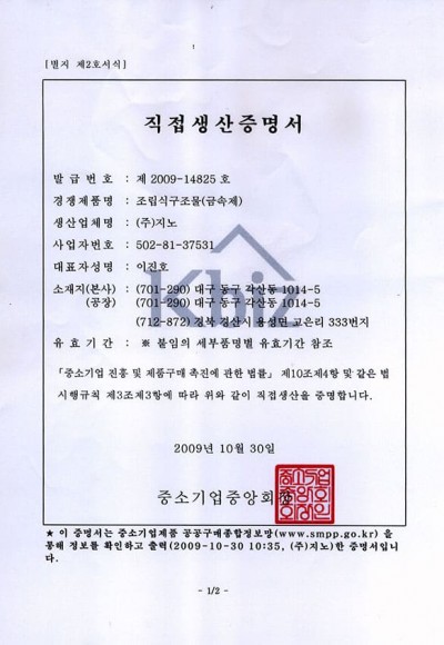 직접생산증명서(금속)